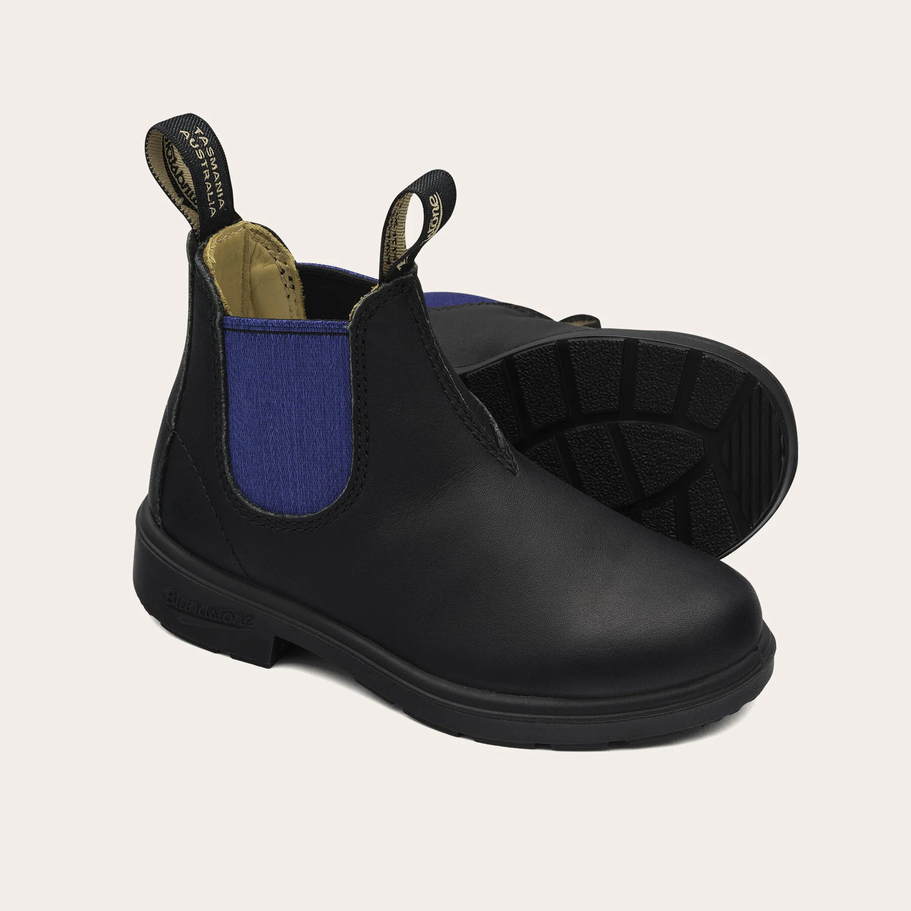La bota Chelsea #580 de Blundstone para niños con un aspecto de lo más estiloso. Confeccionadas en piel negra resistente al agua, se caracterizan por su elástico lateral en un brillante azul eléctrico. Parte superior lisa con costuras delanteras, lengüeta delantera y trasera que facilita el calce y suela de goma antideslizante. Una bota informal de la serie Kids para fashionistas que les proporcionará seguridad, protección y comodidad.